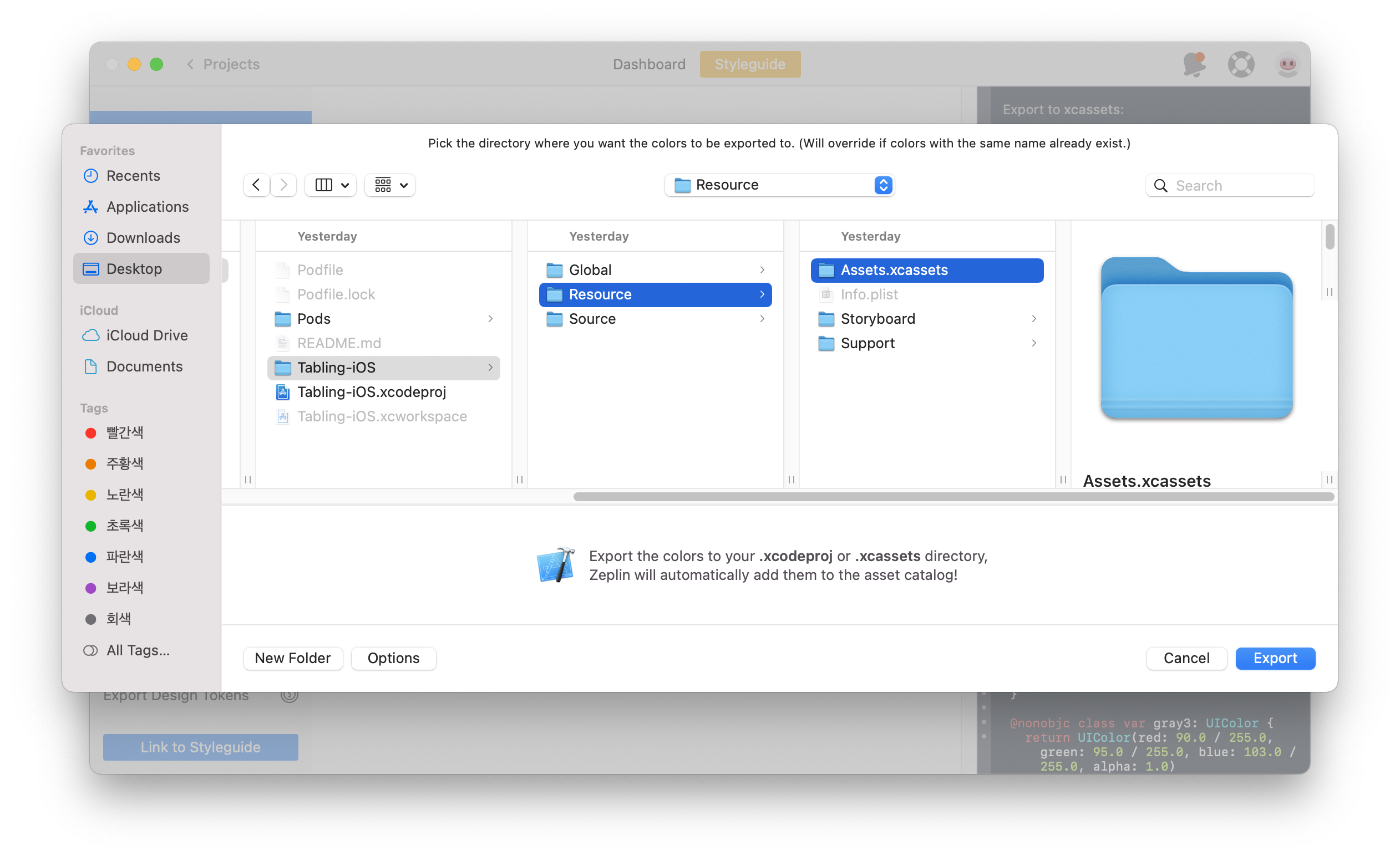 ์ถ๊ฐํ๊ณ ์ถ์ ํ๋ก์ ํธ์ .xcassets ํ์ผ ๊ฒฝ๋ก๋ฅผ ์ ํํ๊ณ Export ๋ฒํผ ๋๋ฌ์ฃผ๋ฉด ๋!