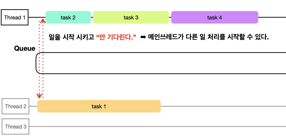๋น๋๊ธฐ๋ผ๋ ๋ง์ ๋ค๋ฅธ ์ฐ๋ ๋๋ก ๋ถ์ฐ์ฒ๋ฆฌ ์ํค๊ณ ๊ทธ์์ ์ด ๋๋๊ธธ “๊ธฐ๋ค๋ฆฌ์ง ์๋๊ฒ" .