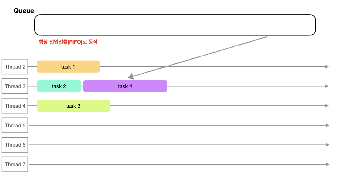 ๊ทธ๋ฆผ์ ๋ณด๋ฉด Queue๊ฐ ์์์ ์ฐ๋ ๋๋ฅผ ๋ฐฐ์น ํด์คฌ๋ค. ๋จผ์ ๋ค์ด์จ๋ ์์ด ๋จผ์ ๋ฐฐ์น๋๋ค.