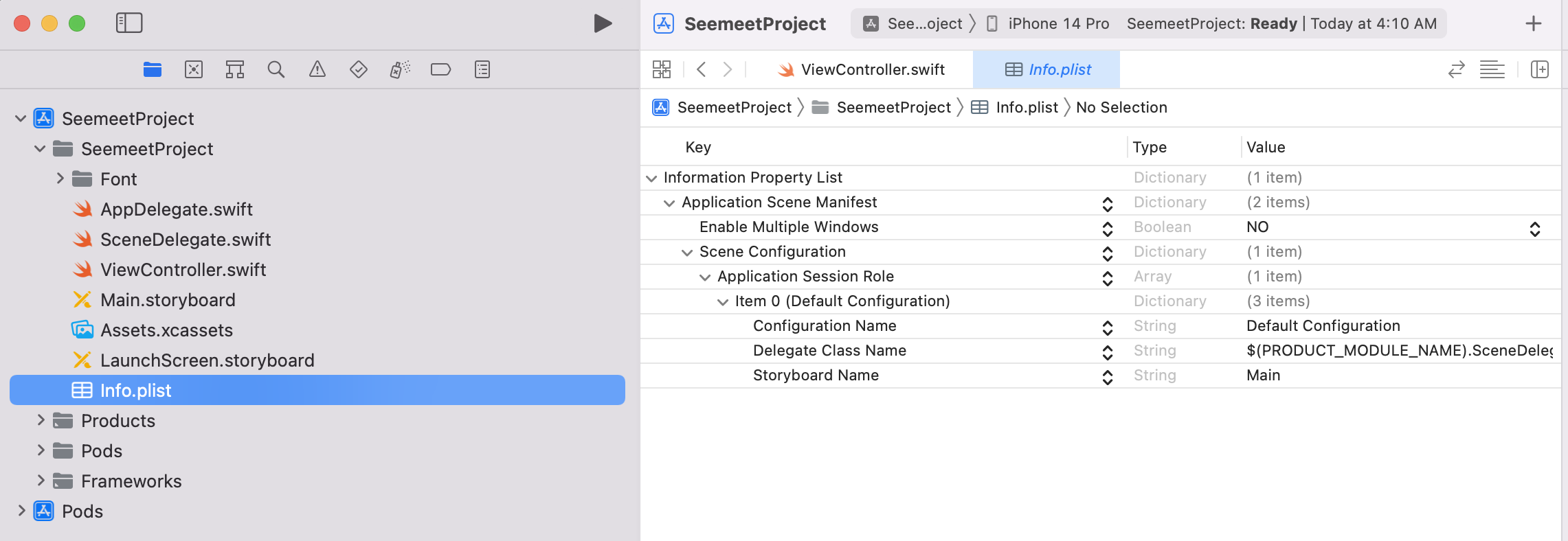 ๋จผ์ , ์ผ์ชฝ์ ๋ค๋น๊ฒ์ด์ ์์ญ์์ info.plist๋ฅผ ์ ํํฉ๋๋ค.