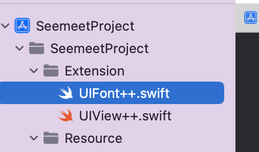 ํฐํธ๋ฅผ ํ ํด๋์ ๋ฃ์ด ๊ด๋ฆฌํ๊ธฐ ์ํด ์ ๋ Xcode ์ผ์ชฝ ๋ค๋น๊ฒ์ด์ ์์ญ์์ ํ๋ก์ ํธ ํด๋ ๋ฐ์ Font ํด๋๋ฅผ ์์ฑ ํด์ค ํ ๊ทธ ์์ ํฐํธ ํ์ผ์ ๋์ด๋ค ๋ฃ์ด์คฌ์ต๋๋ค.