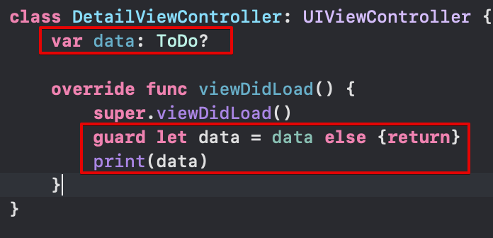๋ฐ์ดํฐ ์ ๋ฌ ๋ฐ์ ๋ทฐ์์๋ ์ ๋ฌ๋ฐ์ ๋ฐ์ดํฐ๋ฅผ ์ต์ ๋๋ก ์ ์ธํ๊ณ ๋ฐ์ดํฐ ์ ๋ฌํ๋ ํจ์๋ก๋ถํฐ ์ ๋ฌ ๋ฐ์ผ๋ฉด viewDidLoad์์ ์ต์ ๋ ๋ฐ์ธ๋ฉ
